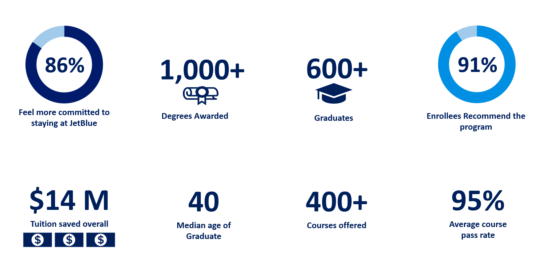 Complete courses online for college credit. Students learn at their own pace, anytime and anywhere, from a mobile device or computer. JetBlue covers the cost and helps students select the required courses to graduate.